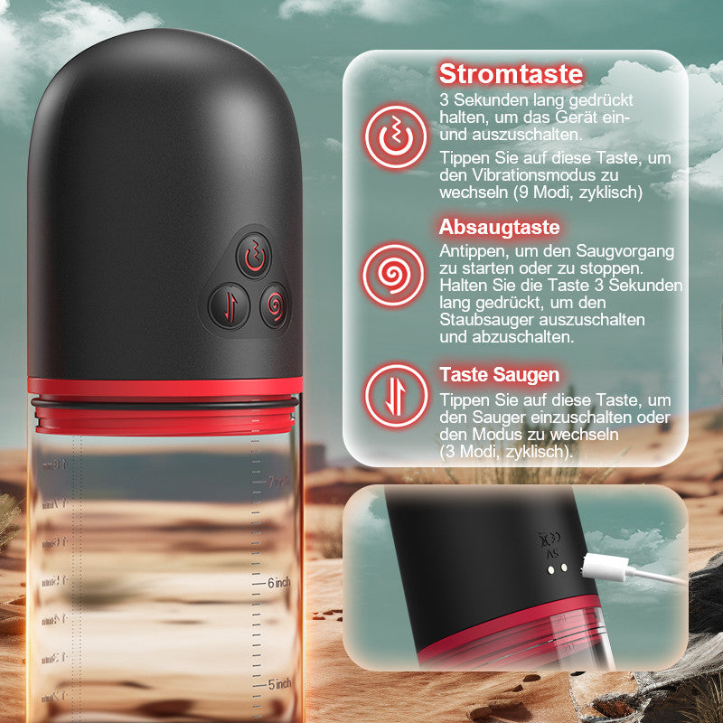 Aktiviere einen der neun Saugmodi. Die vaginaförmige Silikonhülle umschließt deinen Penis eng und dichtet ihn perfekt ab. Du spürst, wie die Luft aus der Kammer langsam entweicht und der Innendruck allmählich ansteigt. Dein Penis scheint sich nach vorne zu strecken. Diese überraschende Veränderung kannst du durch den transparenten Zylinder ganz intuitiv beobachten! Die integrierte Vibrationsfunktion verfeinert das Erlebnis zusätzlich. Die prickelnden Noppen und Rillen sorgen für ein unerwartetes Kratzvergnügen! So kommst du ganz einfach zum Orgasmus! Das Toy lässt sich zudem per USB aufladen und macht dein Sexleben einfacher und angenehmer.